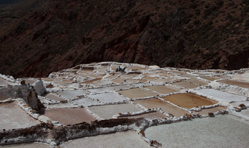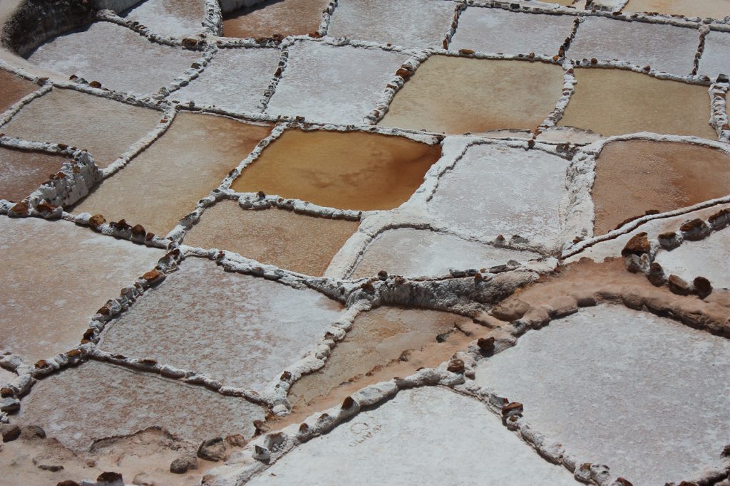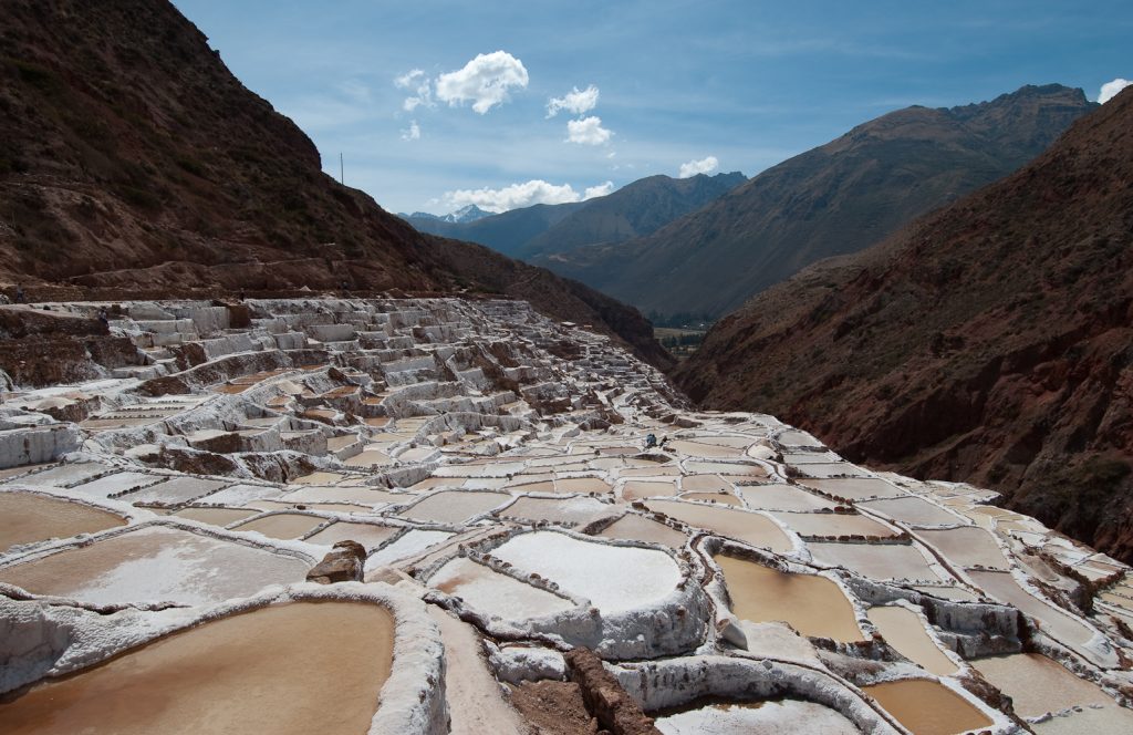 Attraversando l’altipiano, diretti ad Ollantaytambo, ci fermiamo quindi alle saline di Maras, situate in una delle gole che confluiscono nella sottostante valle dell’Urubamba. La scena che si apre sotto i nostri occhi è spettacolare, quando cominciamo a scendere nella gola pian piano il nostro sguardo si focalizza su centinaia di vasche terrazzate che raccolgono l’acqua carica di cloruro di sodio di un bianco abbagliante che contrasta con il giallo ocra della terra circostante.