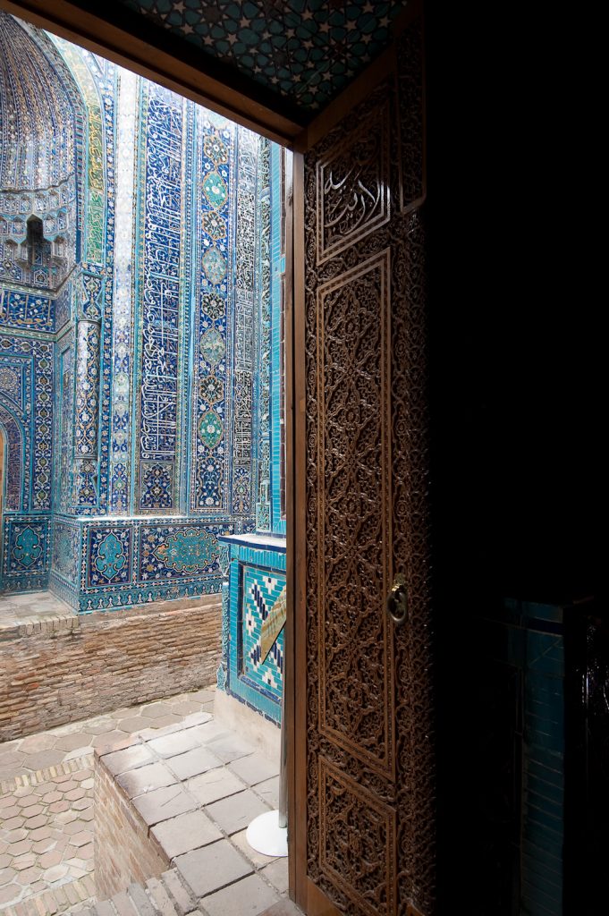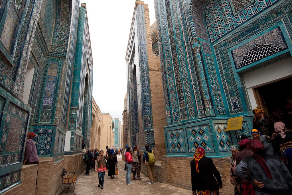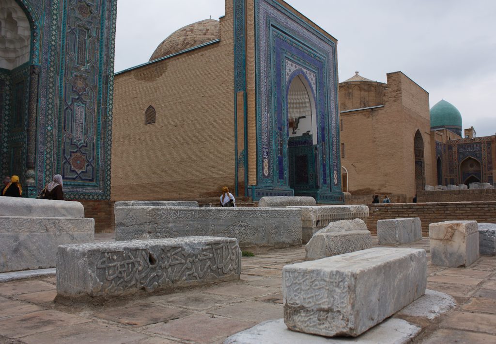 Si tratta di un vasto complesso funerario, un museo a cielo aperto a cui si accede da un magnifico portale del 1400 voluto da Ulug Beg, meta di pellegrinaggio, con un impressionante succedersi di mausolei ciascuno fatto costruire da qualche famiglia aristocratica della città.