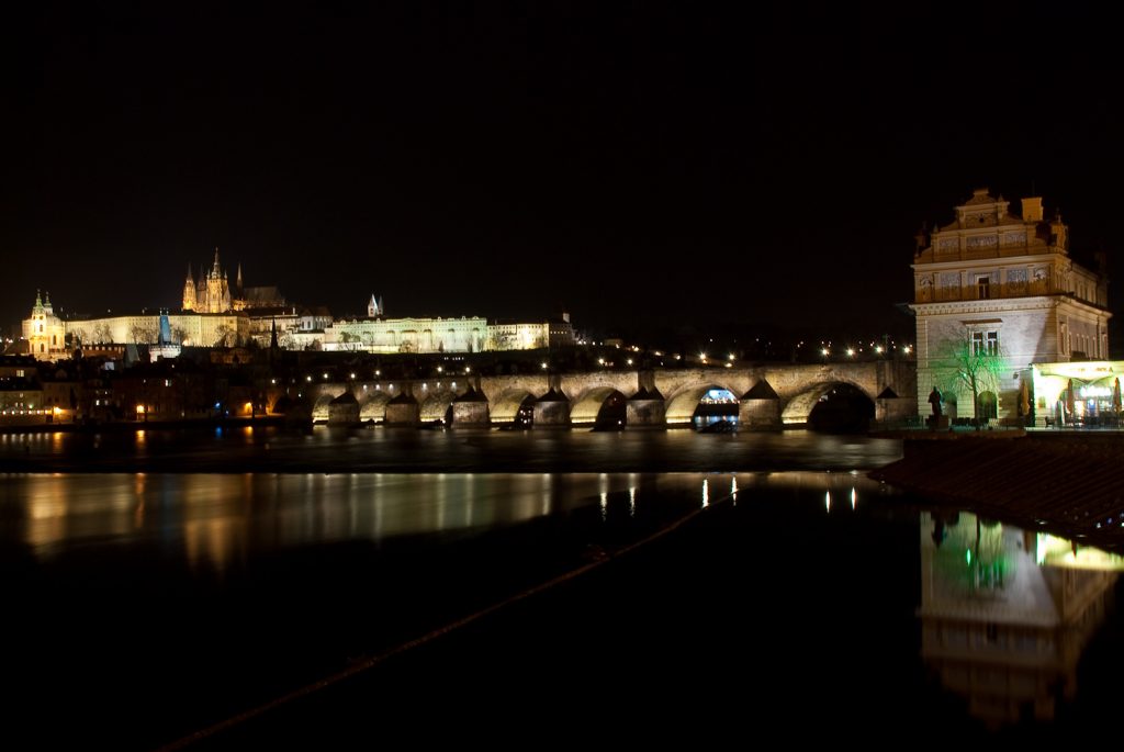 Non è ancora ora di cena, quindi allunghiamo la nostra passeggiata fino al Klementinum, un complesso architettonico molto vasto edificato dai gesuiti e che ospita al suo interno due chiese, tre biblioteche, la cappella degli specchi e la torre Astronomica. La sera le luci della città che si riflette sulla Moldava ci stregano e nonostante il freddo pungente proviamo a racimolare qualche bella fotografia.