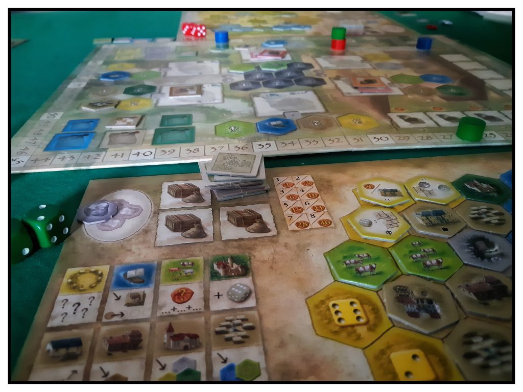 Gianlu parte alla grande e, complice una plancia con molte zone da 2 caselle nelle immediate vicinanze del suo castello, prende subito il largo. Gioca generosamente, non tralasciando nulla: città, merci, miniere, pascoli. Luigi piazza subito un secondo castello e imposta la sua strategia sulle tessere nave per restare primo giocatore, chiude rapidamente diverse aree, macina punti e prende la tecnologia che gli consente di acquistare con le pepite anche dai depositi laterali. Io arranco, non riuscendo a procurarmi che solo una miniera e qualche tessera città; i dadi non mi arridono e rimango ingolfato nel trasporre le tessere sulla mia proprietà, sono lontano da aree con l’acqua ma annaspo ugualmente, non posso piazzare navi: resto ultimo di mano e patisco un distacco di 20-30 punti dai due bricconi.